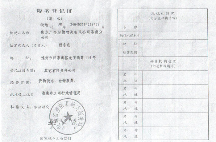 衡水广怀运输物流有限公司淮南分公司税务登记证
